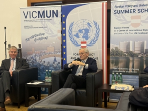 The meeting with former Chancellor Wolfgang Schüssel took place at the invitation of the Austrian Society for Foreign Policy and the United Nations and proved to be exceptionally enriching. In an open and analytical discussion, we discussed the current world situation, geopolitical shifts, and the challenges of multilateral action—with remarkable clarity and perspective based on experience. It was precisely the combination of political analysis and personal reflection that made the encounter so impressive and memorable. Afterwards, we made our way to the Vienna International Centre to visit the United Nations, whose working atmosphere and international density also made a deep impression.